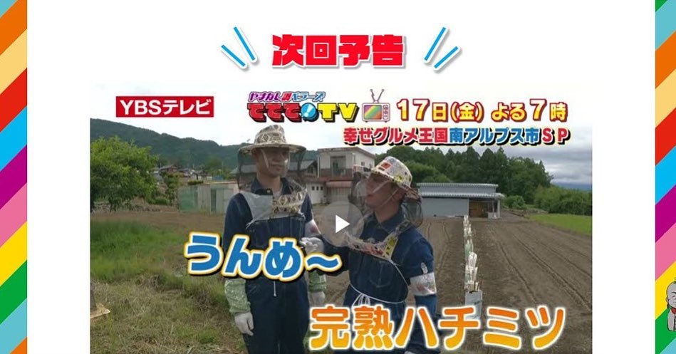 6/17金曜19時〜山梨放送YBSテレビててて!TV幸せグルメ王国南アルプス市SP 番組調べラーのレギュラーでお笑い芸人の「ダンビラムーチョ」さんが、730HONEYの養蜂場へ遊びに来てくれました!番組では、はちみつと南…