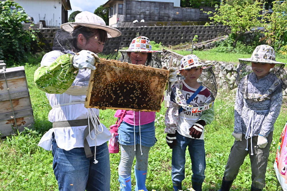 ミツバチ観察会、蜜絞り体験、南アルプス市のカフェスペースFUJI TANADA BARにて昼食、